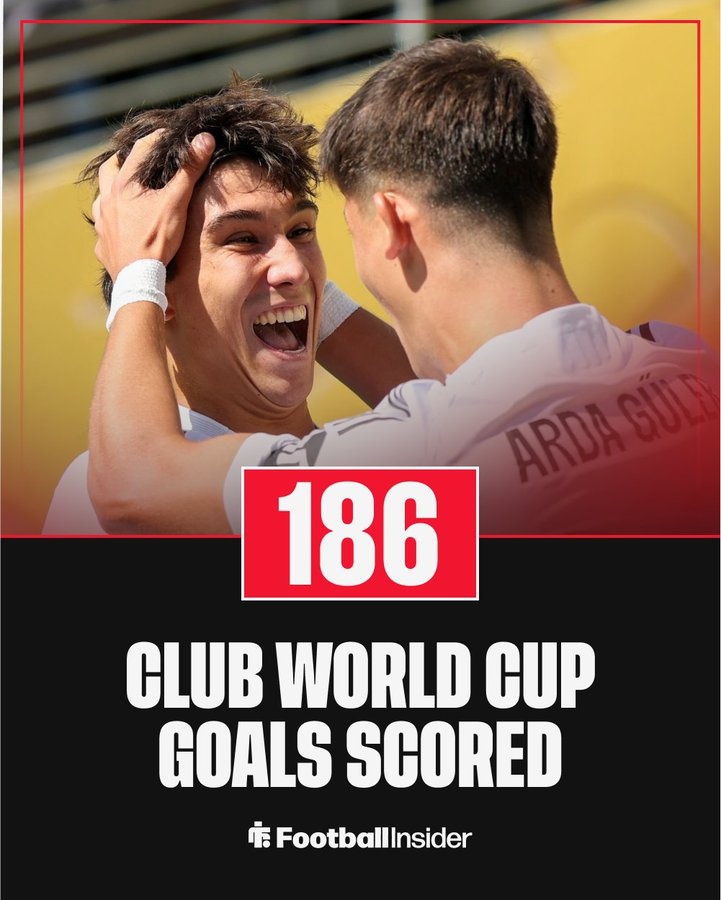 7月8日讯 Football Insider统计,本届世俱杯至今已打入186球,堪称进球盛宴。